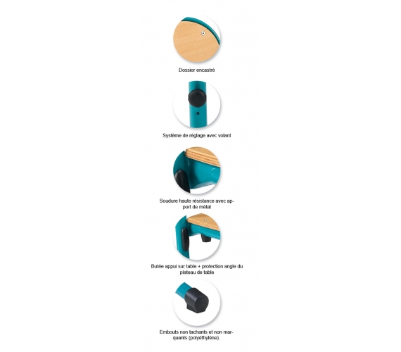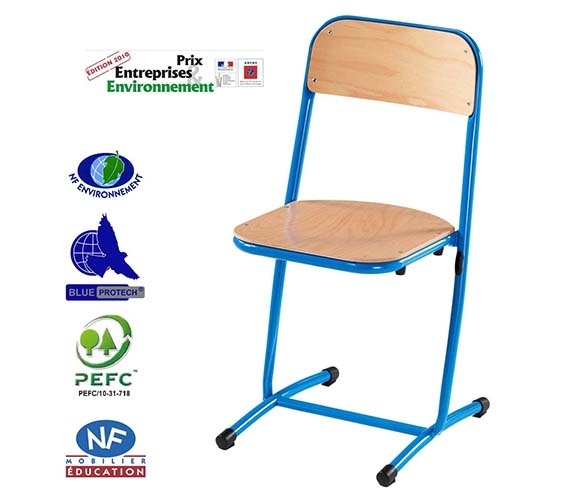Hauteur d’assise :T4, T5, T6, norme européenne NF EN 1729. Produit certifié NF éducation et Environnement. Empilable & appui sur table pour faciliter le nettoyage au sol.